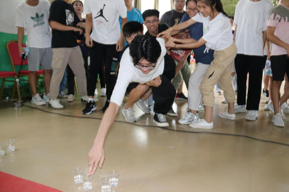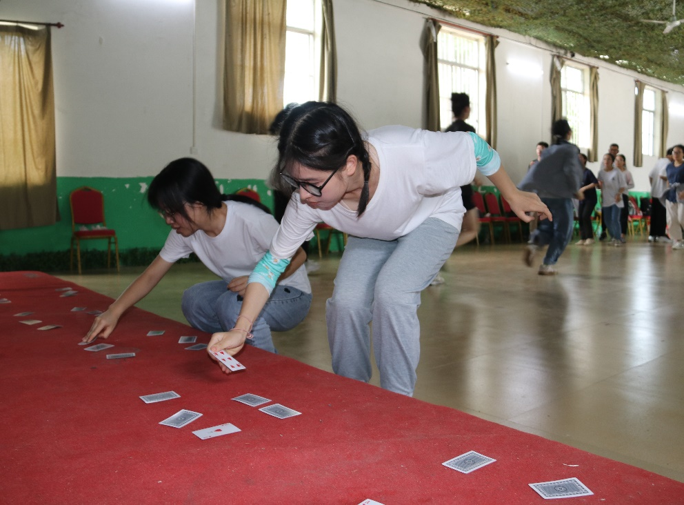 迎着朝阳,同学们到达基地。全体成员被分为6个小组,并分别为各自的队伍想好了队名、队歌以及队伍的招牌动作,在教官的指导下,开展了“达芬奇密码”、“雷阵取水”拓展训练活动。“ 单丝不成线,独木不成林”,在训练过程中,各小组团队协作,相互配合,遵照既定的思绪和战术计谋,增进了彼此的信任与默契,提升了团队凝聚力和团队协作精神。