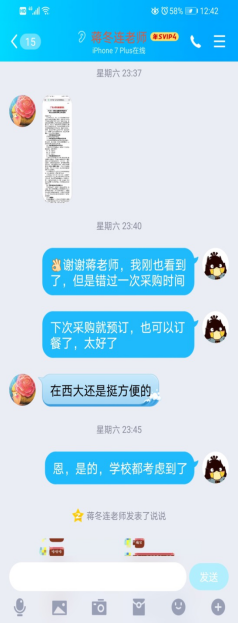 再相见,温暖如故。下车到了校门口,看到门口值班的保安、老师、医生正在认真检查出入的行人车辆。我再次被感动到了,昔日充满欢声笑语的校门,安静了许多,只有防疫人员忙碌而温暖的背影。经过测温登记,我记下值班老师的温馨提示,踏入春天里的西大。“老师,你要直奔住处,居家期间不能出门”听到这句话,走在安静的校园里的我,内心开始忐忑不安。因为原以为居家可以偶尔在校内活动,所以除了面条并不带其他食物返校。很快,还没到住处,学院唐玥老师就发来消息告诉我居家观察注意事项,并为我积极谋划“居家攻略”。刚到家门口,邻居好心的阿姨答应了帮我买菜。当晚,学工组孙晓黎老师也主动提出为我买菜。她的一句“缺啥我也可以帮你买,放到家门口。”让我忐忑的心平静了下来,深切感受到电气学工组的友爱与温暖。这些天她已经多次主动为我买菜并送到家门口,成了暖心的“买菜姐姐”,冰箱里的菜暖暖的。让原已打算以吃面条度过居家观察14天的我,也能吃上新鲜的肉和蔬菜了。万分感激!还有农学院辅导员梁琪老师2次主动帮我领快递,她还不辞辛苦将沉重的快递搬到家门口,成了暖心的“快递小哥”,温暖穿门入心。还有感谢学院石建有老师、蒋冬连老师的热情关心与帮助,真心非常感谢大家!有了大家的帮助很好保障了我在居家隔离期间的正常生活。疫情当前,这些看似件件小事,但件件都是暖心事,老师们的善良友爱、团结互助,让我铭记于心,再次抱歉给大家添麻烦了,非常感谢大家!