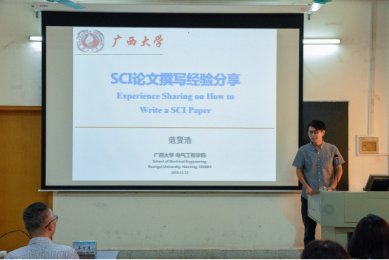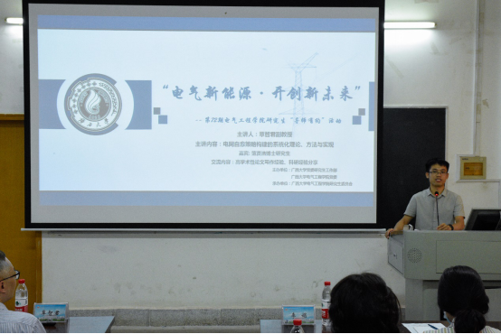 202011月22下午,广西大学电气工程学院成功举办第72“导师有约”学术讲座。该活动围绕“电气新能源·开创新未来”的主题,特别邀请广西大学beats365(中国区)-唯一官方网站的覃智君老师为主讲人,做契合本次活动主题的学术前沿讲座和科研成果展示,以及优秀博士研究生范贤浩为特约嘉宾,做关于SCI、EI论文等高学术性论文写作经验分享。会议由辅导员魏书颂主持。