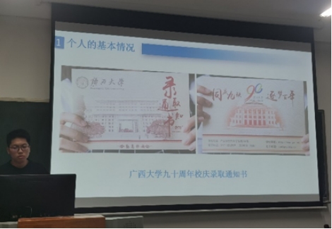 其中,花泽艺同志分享了自己在广西大学的求学历程,展示了自己的广西大学九十周年校庆本科录取通知书与研究生录取通知书。从西大本科到研究生,既是一种传承,又是一种发展。他表示在研究生生涯将会继续努力,不断进步。