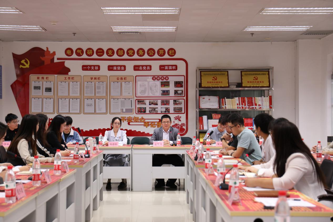 广西大学电气研二支部书记徐俊华老师在座谈会上介绍了“七抓七有力”的研究生支部党建工作体系,重点讲解了支部党员发展积分制、支部材料云宝库等特色工作模式,得到了在场师生党员的认可。