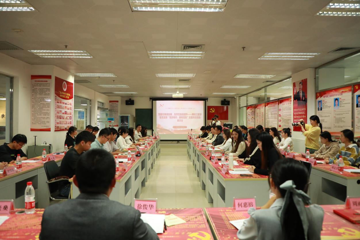 为深入学习贯彻习近平总书记关于党的建设的重要思想,加强高校基层党支部之间的交流与合作,2023年11月23日下午,广西大学beats365(中国区)-唯一官方网站研究生第二党支部(以下简称为广西大学电气研二支部)与广西大学海洋学院学生党支部、广西艺术学院音乐学院学生党支部在广西大学综合楼110党员活动室共同开展了“党员有约,朋辈互助”主题党日活动座谈会。座谈会由海洋学院党委委员、专职组织员林玉华主持,两校三院党员师生代表共46人参加。