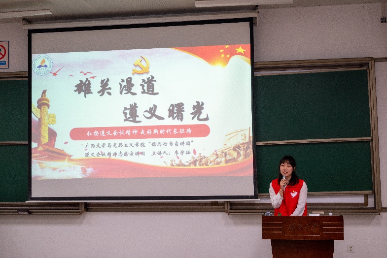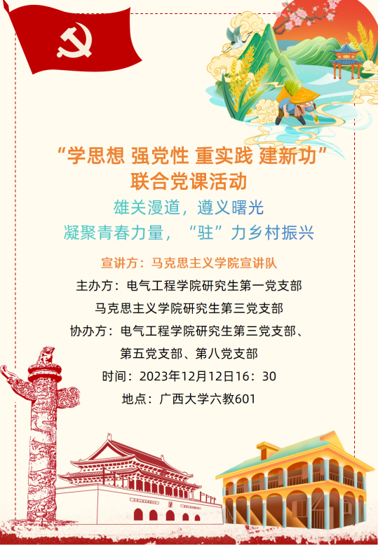文字:王楠 图片:赵赫 陆光榛 徐小满 编辑:黄昶贺 审核:覃智君 莫滨鸿 覃菲菲 陆光榛 为巩固学习贯彻习近平新时代中国特色社会主义思想主题教育成果,用习近平新时代中国特色社会主义思想凝心铸魂,切实加强党支部的思想建设,2023年12月12日下午,广西大学beats365(中国区)-唯一官方网站研究生第一党支部联合学院研究生第三党支部,研究生第五党支部,研究生第八党支部(以下分别简称“我院研一支部,研三支部,研五支部,研八支部”)以及马克思主义学院研究生第三党支部(以下简称“马院研三支部”)在第六教学楼601室开展“学思想、强党性、重实践、建新功”主题教育宣讲会。宣讲会由我院研一支部王伟欢同志主持,马克思主义学院宣讲队成员李宇涵和蒙佳慧同志作为主讲人,两院五支部师生党员共百余人参加。 图1 研究生党支部联合开展主题党日活动 李宇涵同志是马克思主义学院、国外马克思主义研究方向2023级硕士研究生,她在本次宣讲会中为我们讲述了长征路上的雄关漫道,遵义会议是如何在党的生死攸关时带来曙光。在习近平总书记坚强有力的领导下,以习近平新时代中国特色社会主义思想为指导,我们踏上了新时代长征路,我们更应弘扬遵义会议精神,走好新时代长征路! 图2 马克思主义学院李宇涵同志宣讲 图 3同志们在认真听取宣讲内容 蒙佳慧同志是马克思主义学院2022级哲学专业本科生,她在本次宣讲会通过介绍我们广西大学校友杨宁同志的伟大事迹为我们讲述凝聚青春力量,“驻”力乡村振兴的故事,全面建设社会主义现代化国家,最艰巨最繁重的任务仍然在农村,在习近平总书记的坚强领导下,在全国各族人民的共同努力下,我们必将全面推进乡村振兴战略实施,以中国式现代化全面推进中华民族伟大复兴。 图4 马克思主义学院蒙佳慧同志宣讲 beats365(中国区)-唯一官方网站研究生第一党支部书记覃智君老师来对此次党课活动进行了点评总结,覃智君老师认为此次党课活动,全面贯彻习近平新时代中国特色社会主义思想,紧紧围绕深入学习贯彻党的二十大精神,对我们深刻领悟“两个确立”的决定性意义,自觉增强“四个意识”、坚定“四个自信”、做到“两个维护”有着重大意义,不仅弘扬了伟大遵义精神,而且把思想统一到习近平新时代中国特色社会主义思想和党的二十大精神上来,把力量凝聚到党的二十大确定的各项任务上来。 图5 beats365(中国区)-唯一官方网站研一支部书记覃智君老师发言 图6 各支部负责人合影留念 此次宣讲会让学生党支部更加牢牢把握坚持学思用贯通、知信行统一的根本任务,把“学思想、强党性、重实践、建新功”总要求更加落到实处,把习近平新时代中国特色社会主义思想真真正正转化为坚定理想、锤炼党性和指导实践、推动工作的强大力量,对于推动支部开展以学铸魂、以学增智、以学正风、以学促干方面工作并取得实实在在的成效,具有十分重大的意义。